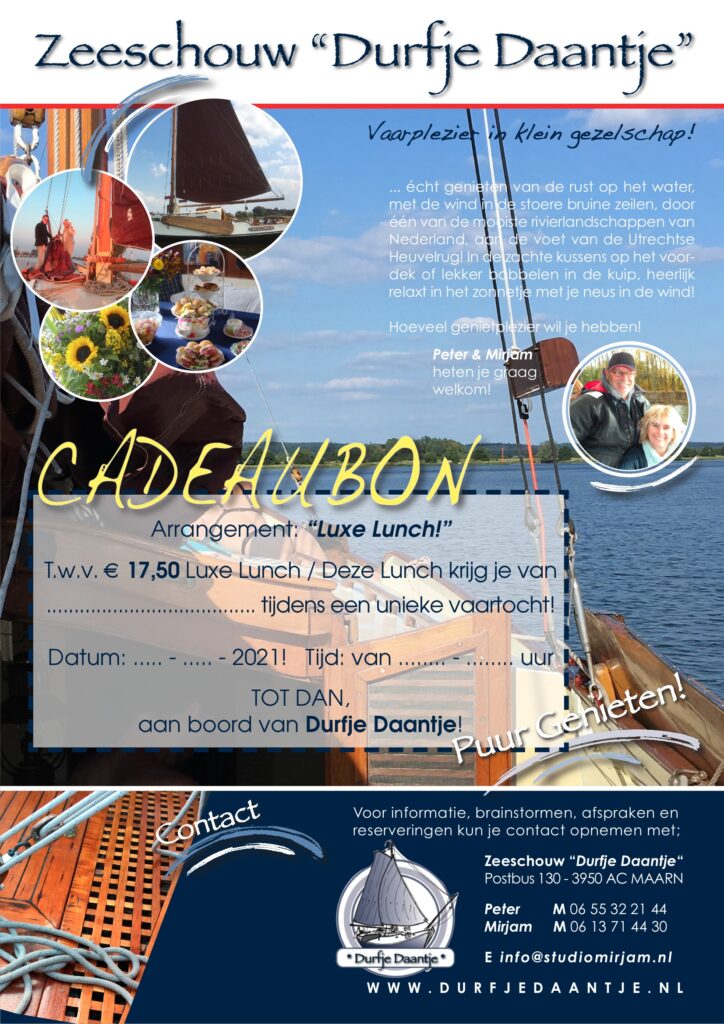 Varen met Zeeschouw ‘Durfje Daantje‘ zorgt voor fijn, uniek en ultiem vaarplezier rond Wijk bij Duurstede. Als het even kan met de wind in de oude bruine zeilen.